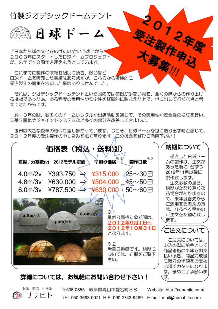 2012年9月1日~10月31日の期間中にご注文頂いた場合は、早割り価格の対象となりますので、以前より、日球ドームについて興味のある方は、この機会にぜひご検討頂ければ幸いです。