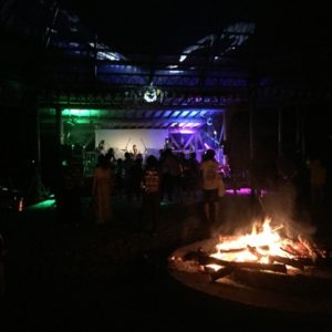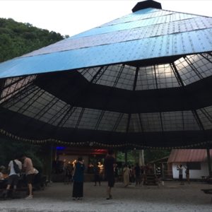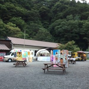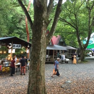 これまで小菅村というと何度も日球ドームを使ってくれたことがある秘境祭が行われていた玉川キャンプ村の印象が強かったのですが、今回の会場となった平山キャンプ場はその隣にあり、敷地内を流れる渓流に沿って三角屋根のコテージが綺麗に並び立ち、大きなトンガリ屋根のあるステージを完備するなど、充実した設備と気持ちのいいロケーションは玉川キャンプ村に負けず劣らず。秘境祭が今年から別の会場に移っても小菅村に呼ばれる事になんだか不思議なご縁を感じずにいられません。