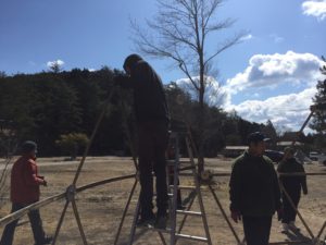 2020年3月24日、岐阜県恵那市の飯地高原自然テント村にて日球ドームセルフビルドワークショップ(インスタレーション版)を実施しました。