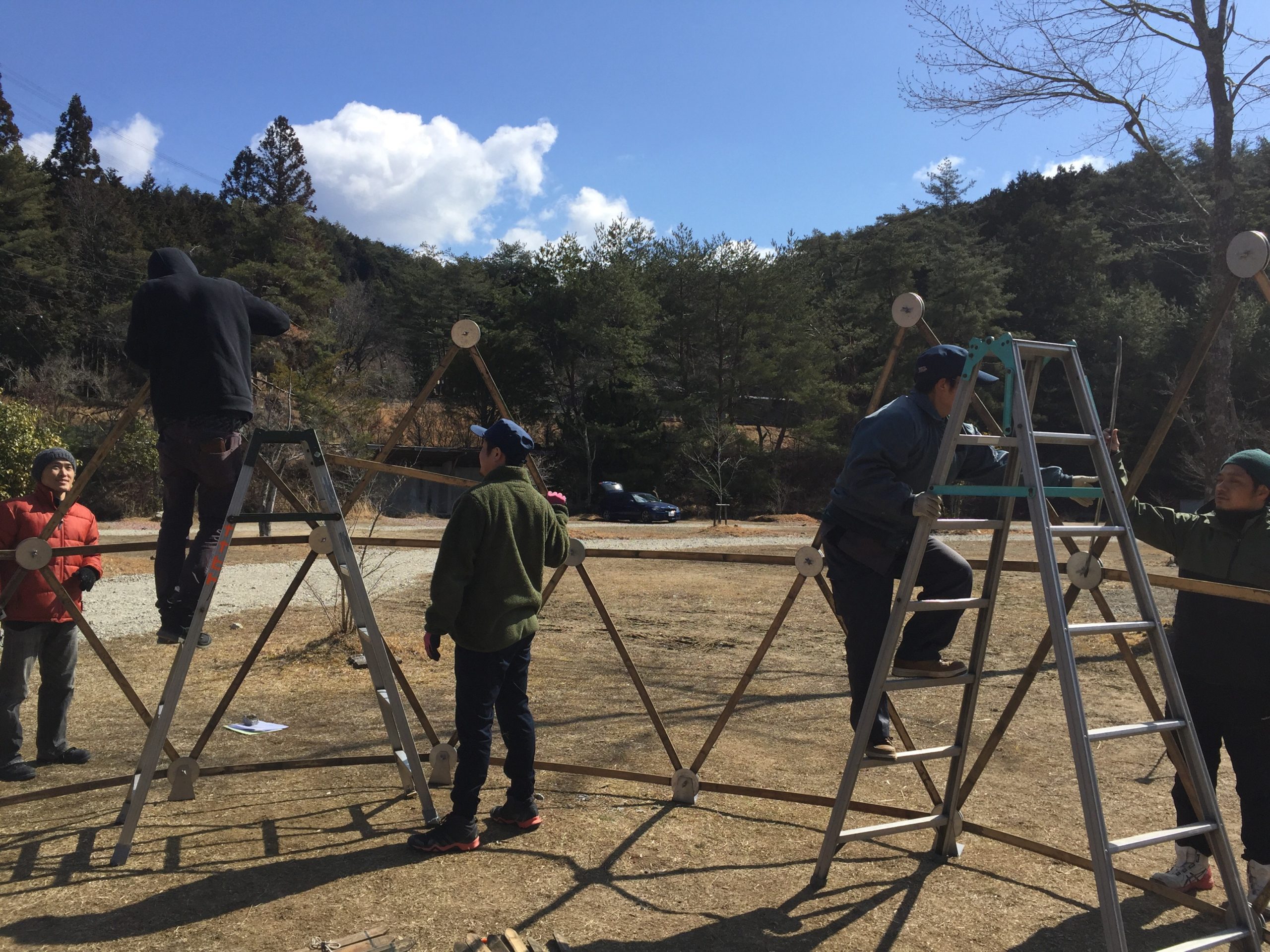2020年3月24日、岐阜県恵那市の飯地高原自然テント村にて日球ドームセルフビルドワークショップ(インスタレーション版)を実施しました。