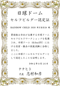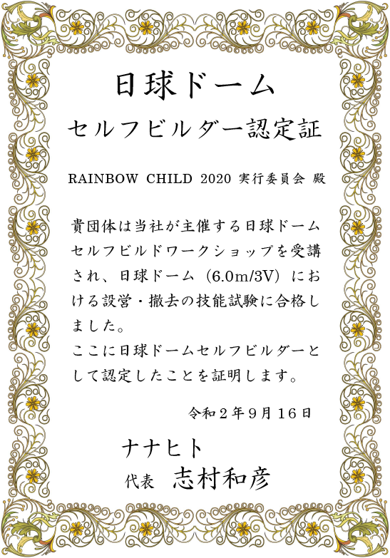 RAINBOW CHILD 2020 実行委員会様には、【日球ドームセルフビルダー認定証】が授与しました。