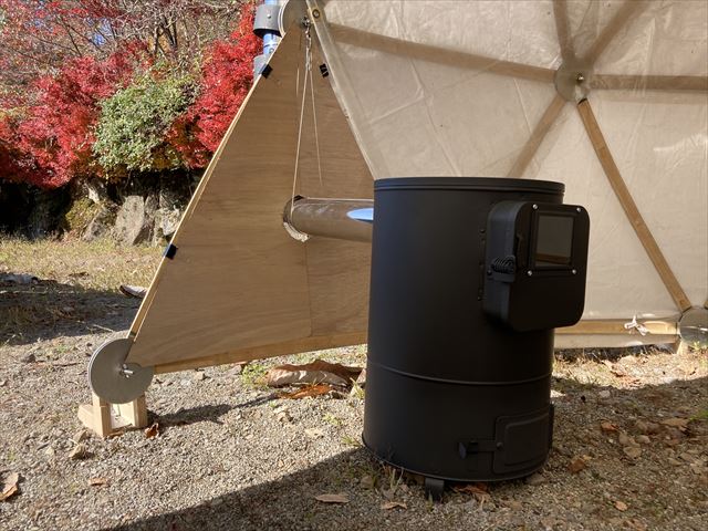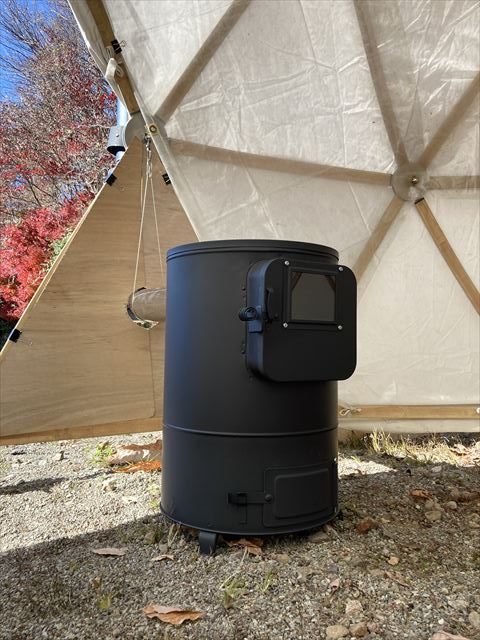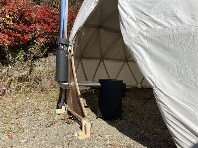 ただでさえ寒さの厳しい飛騨高山の山奥で11月に野外イベントをやるという話を聞き、ちょうど11月の定例セルフビルドワークショップの時期と重なった為、イベント前日の13日に設営・終了後の16日に撤去という流れでBagusCampとコラボレーションが決まり、日球ドームは「まこも舟のワークショップ」をやる場所として使われることになった訳ですが、その作業を少しでも暖かく取り組めるように今回は日球ドームに薪ストーブを取り付けました。