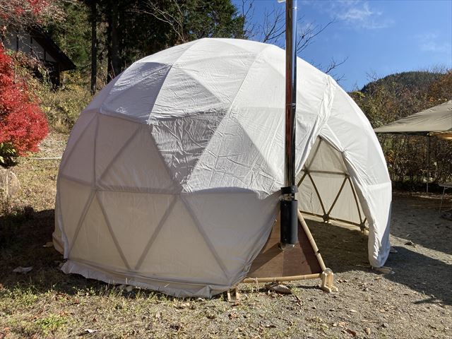 秋もすっかり深まり、もう冬の足音が聞こえてくる2020年11月14~15日、飛騨高山で開催されたBagus Camp(例年マヤ暦の時間を外した日(7月25日)にやっている恒例のお祭りですが、コロナの影響でイベントが少なかったこともあり、今年は3回目!)で日球ドーム(4.8m/3V)を設営しました。