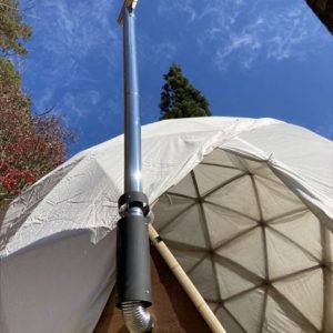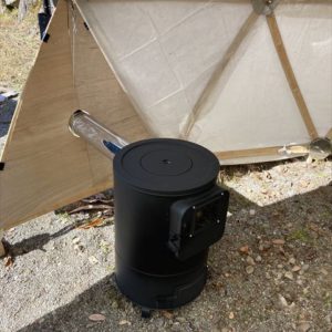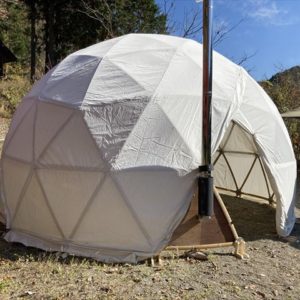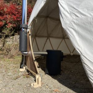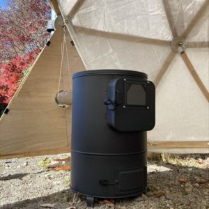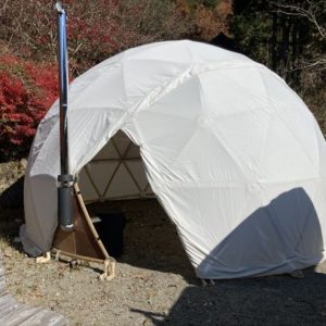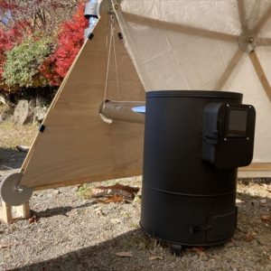 ただでさえ寒さの厳しい飛騨高山の山奥で11月に野外イベントをやるという話を聞き、ちょうど11月の定例セルフビルドワークショップの時期と重なった為、イベント前日の13日に設営・終了後の16日に撤去という流れでBagusCampとコラボレーションが決まり、日球ドームは「まこも舟のワークショップ」をやる場所として使われることになった訳ですが、その作業を少しでも暖かく取り組めるように今回は日球ドームに薪ストーブを取り付けました。
