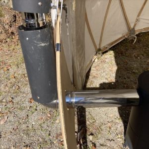 ストーブから延びる煙突をジョイント中心から吊り下げたワイヤーで支え、煙突の横倒れを防ぐ為のガイドを径の大きな煙突を切ってジョイントの外側に付け、ドームから煙突が出る部分に直角三角形型の板で挟んだ風防を取り付ける。至って簡単な作りです。また子供が触りそうな高さにも径の太い煙突を付け二重煙突にすることで、高熱を持つ煙突に直接触れたりしないようにしました。