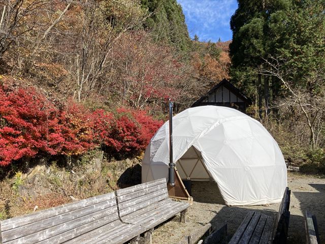 秋もすっかり深まり、もう冬の足音が聞こえてくる2020年11月14~15日、飛騨高山で開催されたBagus Camp(例年マヤ暦の時間を外した日(7月25日)にやっている恒例のお祭りですが、コロナの影響でイベントが少なかったこともあり、今年は3回目!)で日球ドーム(4.8m/3V)を設営しました。