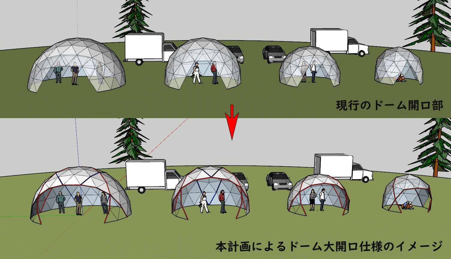 ジオデシックドームは本来的には、面的に受けた風荷重をすべてのフレームで分散して受け逃がすという構造的な性質があり、フレームを取り除くという事は、その構造的な強度を損なう事に直結する為、以前より大きな間口で使いたいという要望を数多くいただきながらも、経験則に基づいた間口(上記画像の上半分のドームの状態)を推奨の上で、利用していただくように対応してきました。