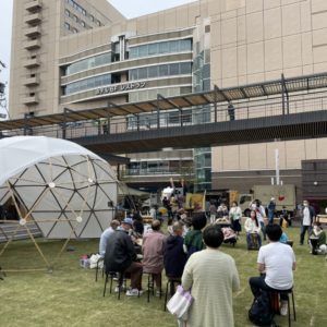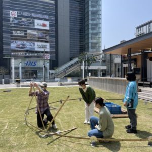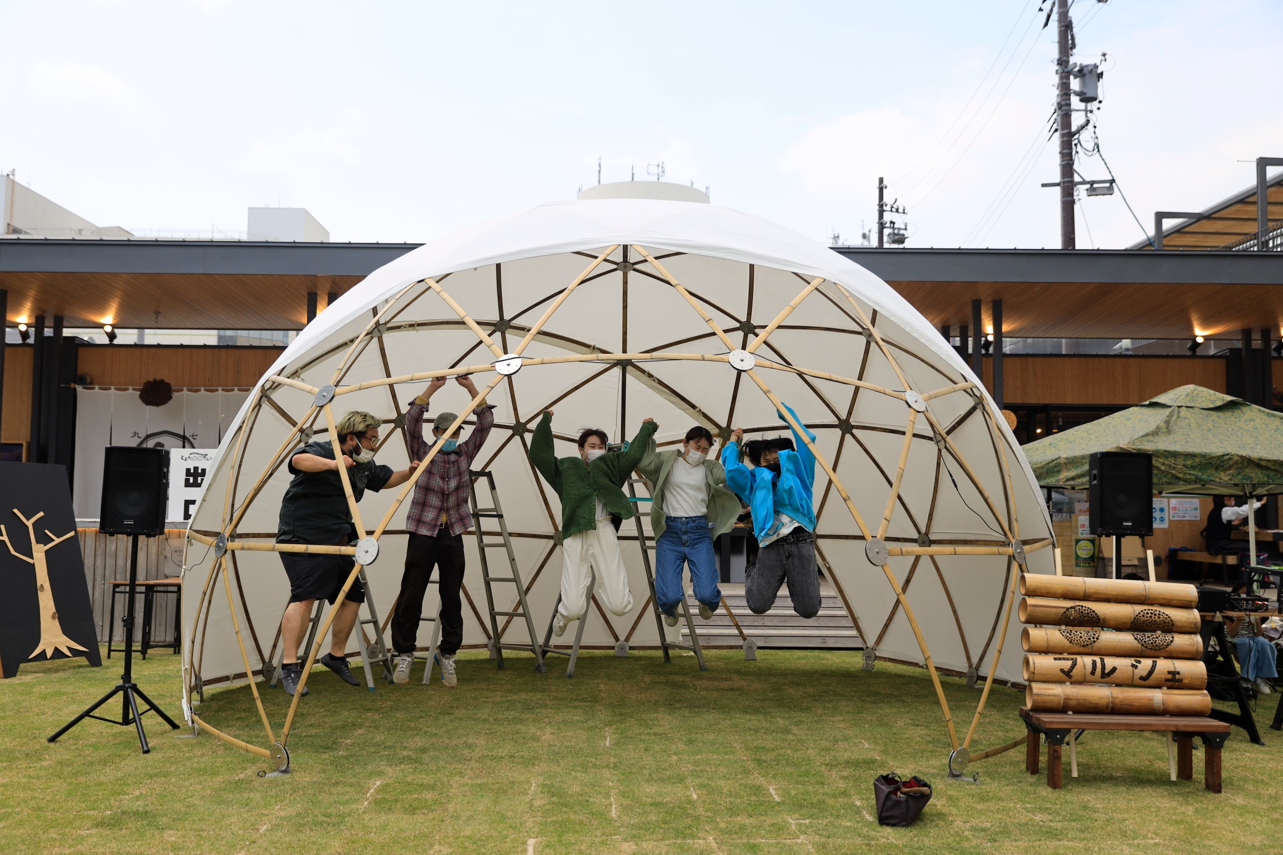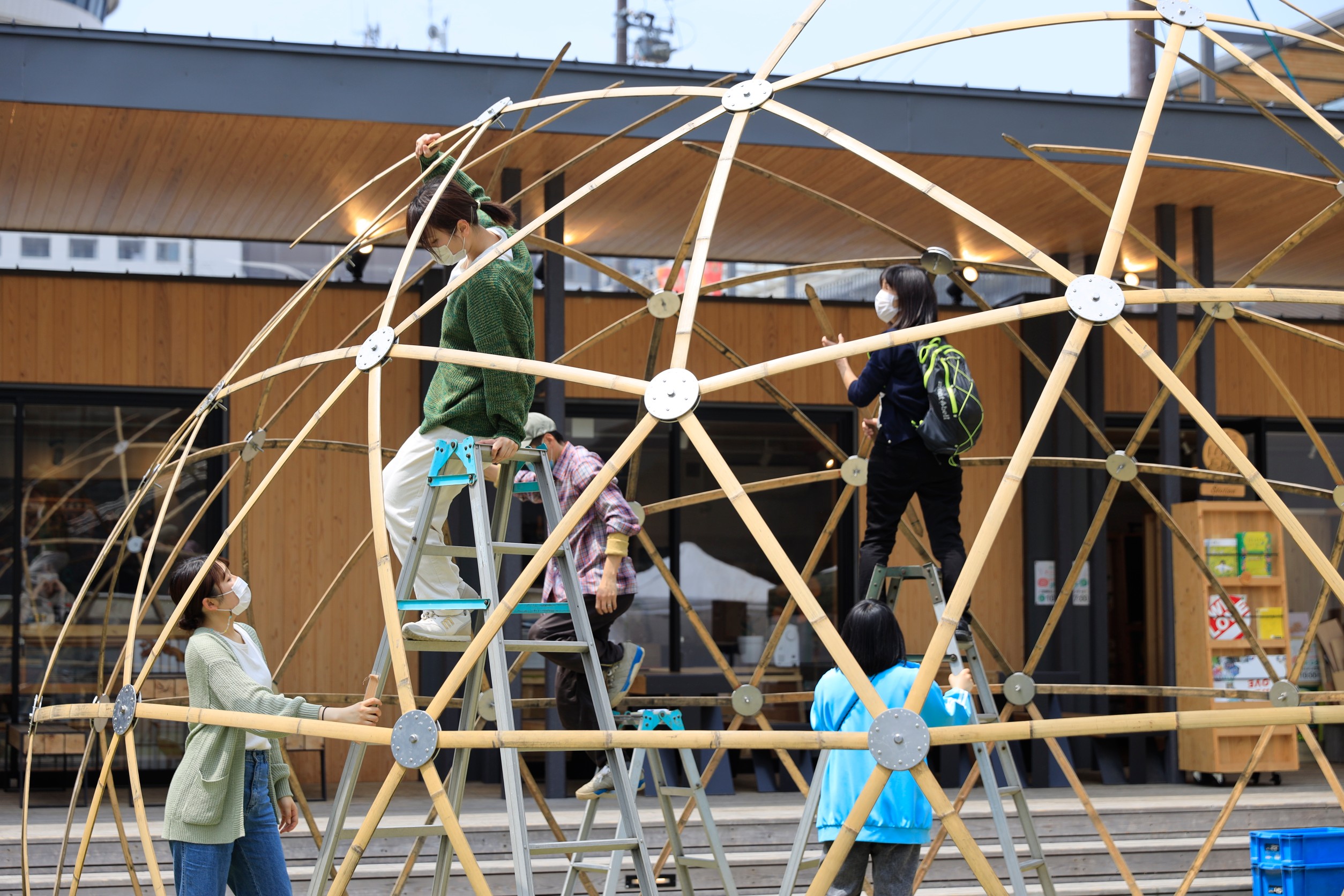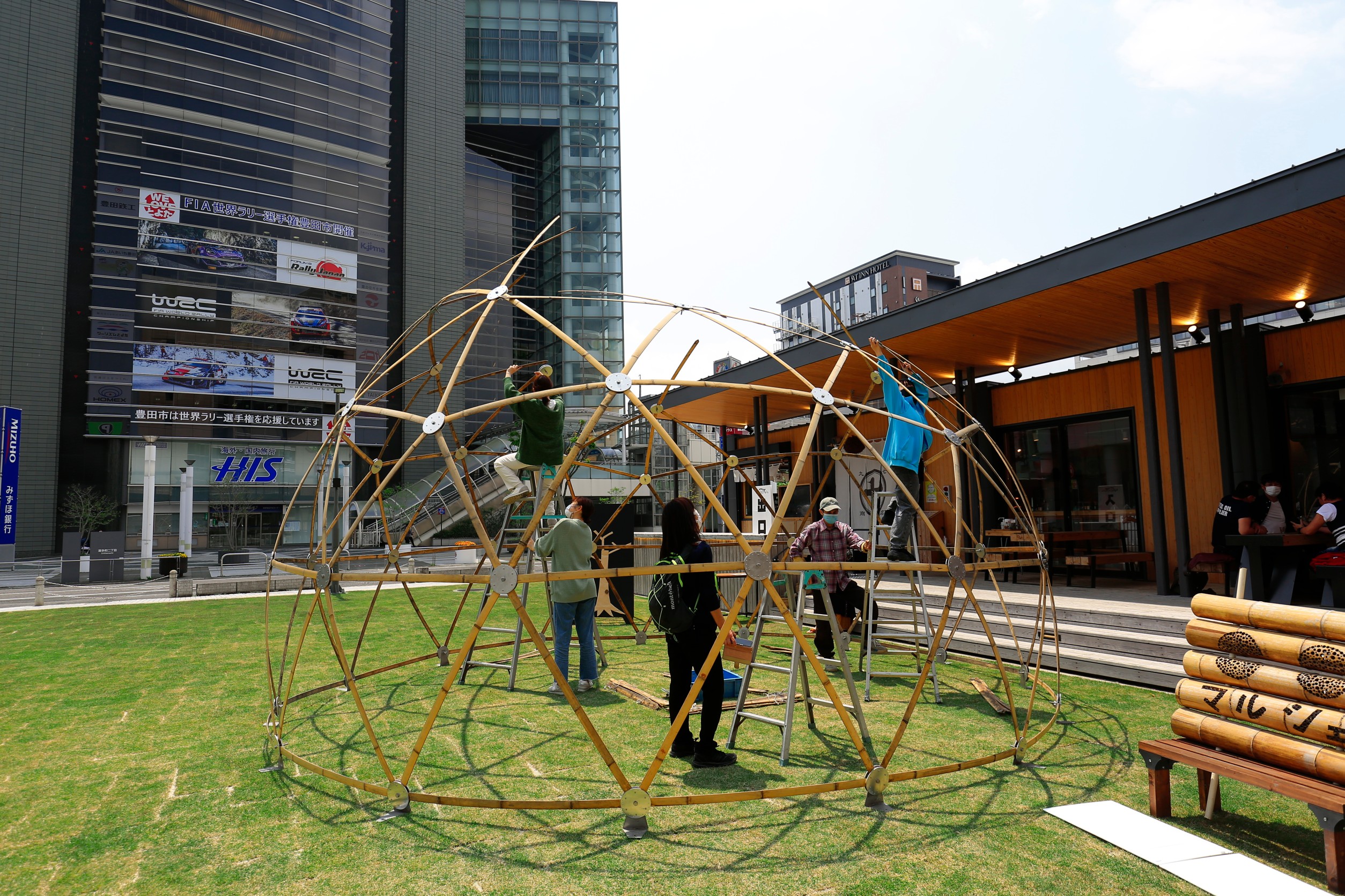 すっかり春の陽気に包まれた2022年4月23日、豊田市駅前にある広場とよしばで開催されたとよた〇〇マルシェにて、6mドームセルフビルドワークショップを実施しました。