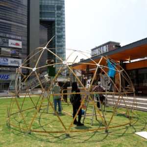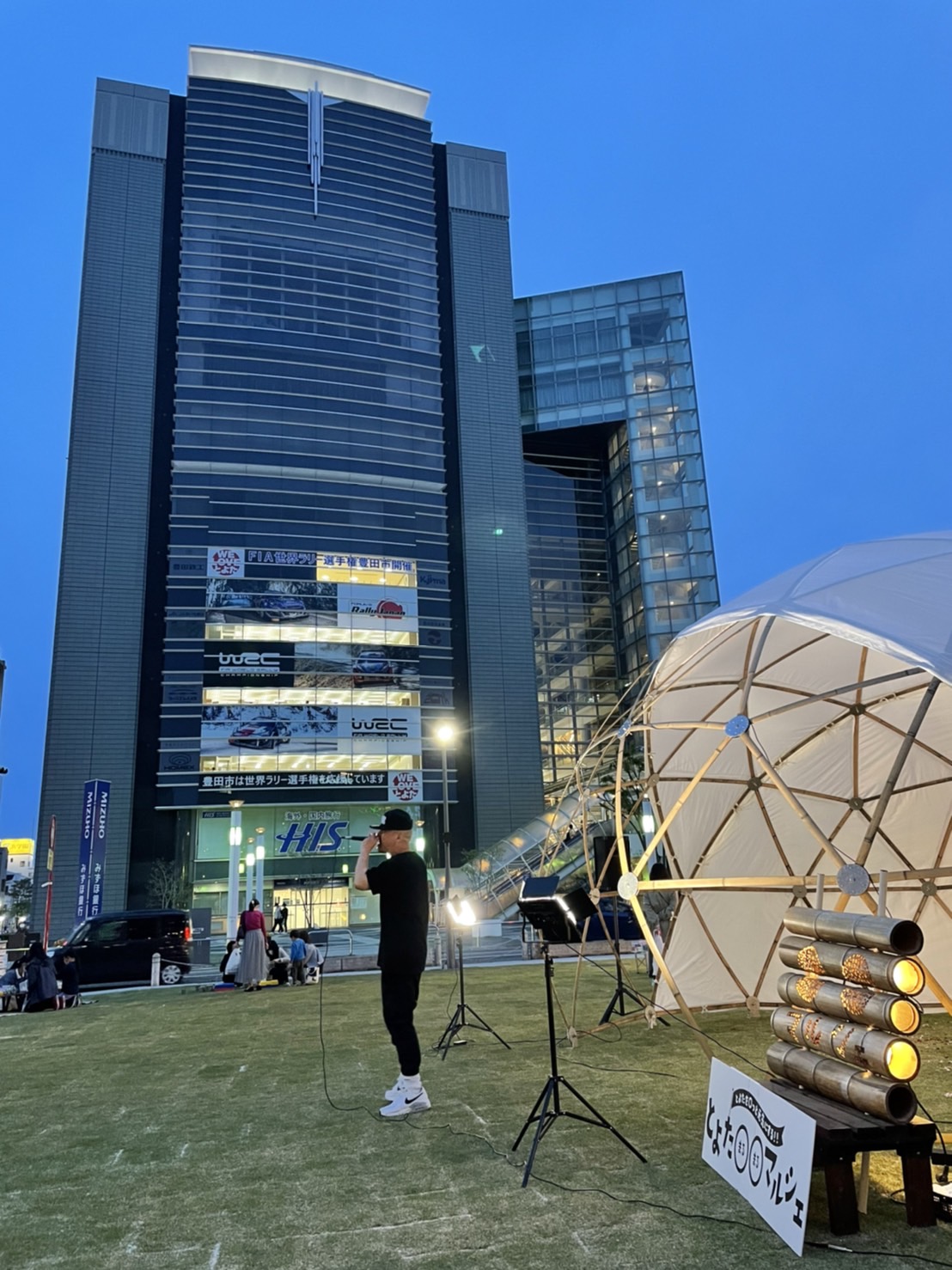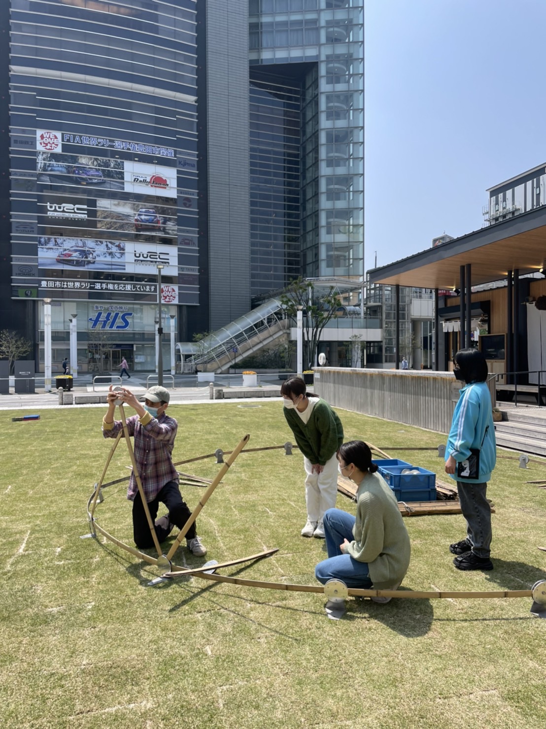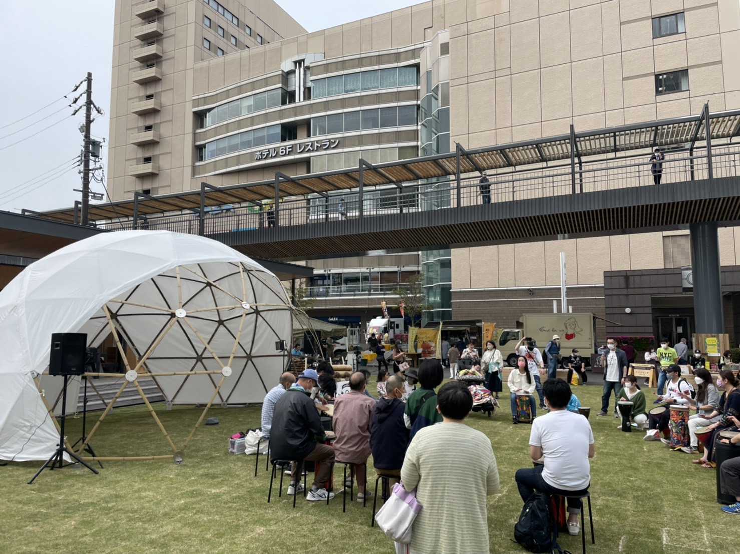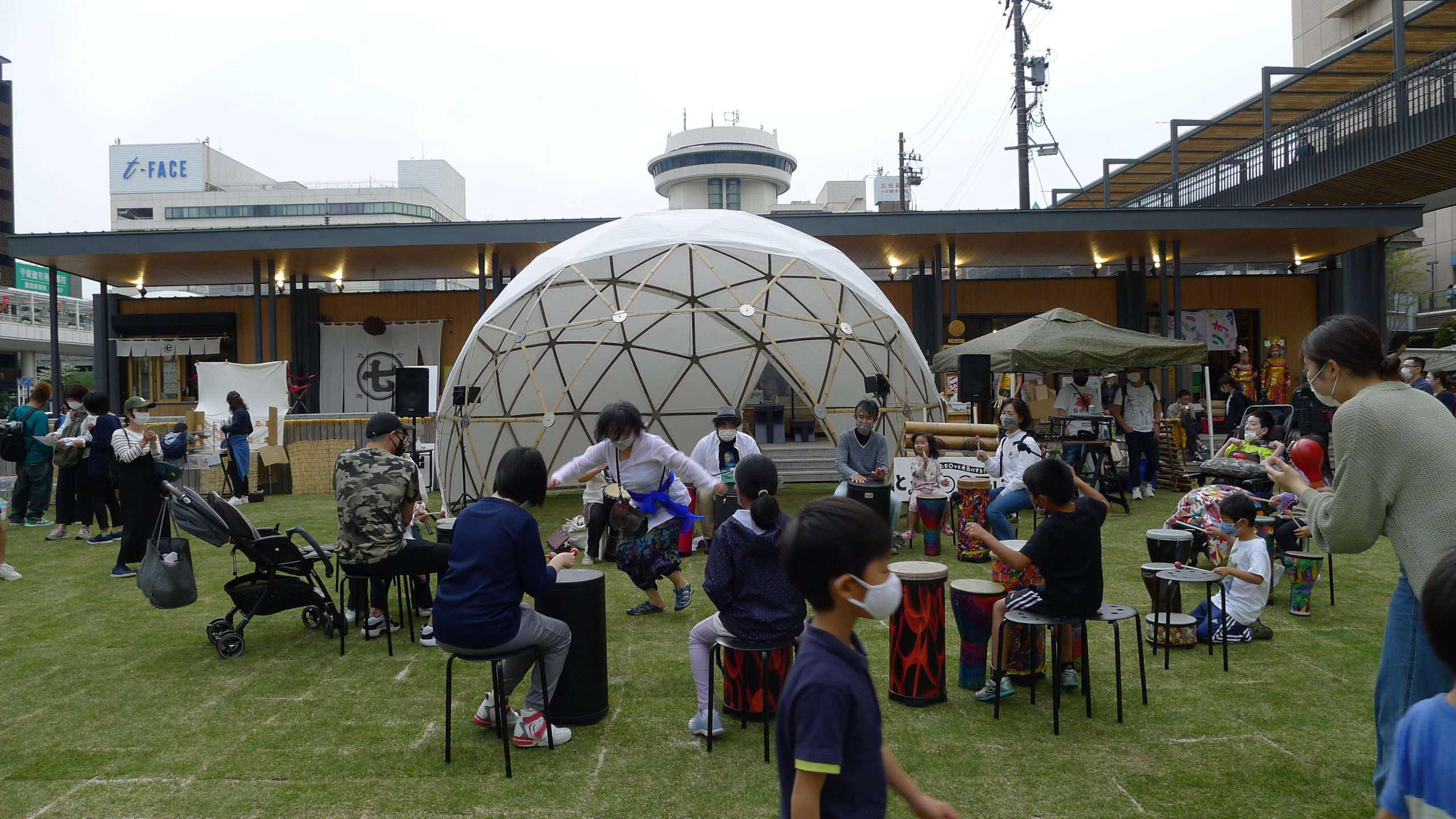 すっかり春の陽気に包まれた2022年4月23日、豊田市駅前にある広場とよしばで開催されたとよた〇〇マルシェにて、6mドームセルフビルドワークショップを実施しました。