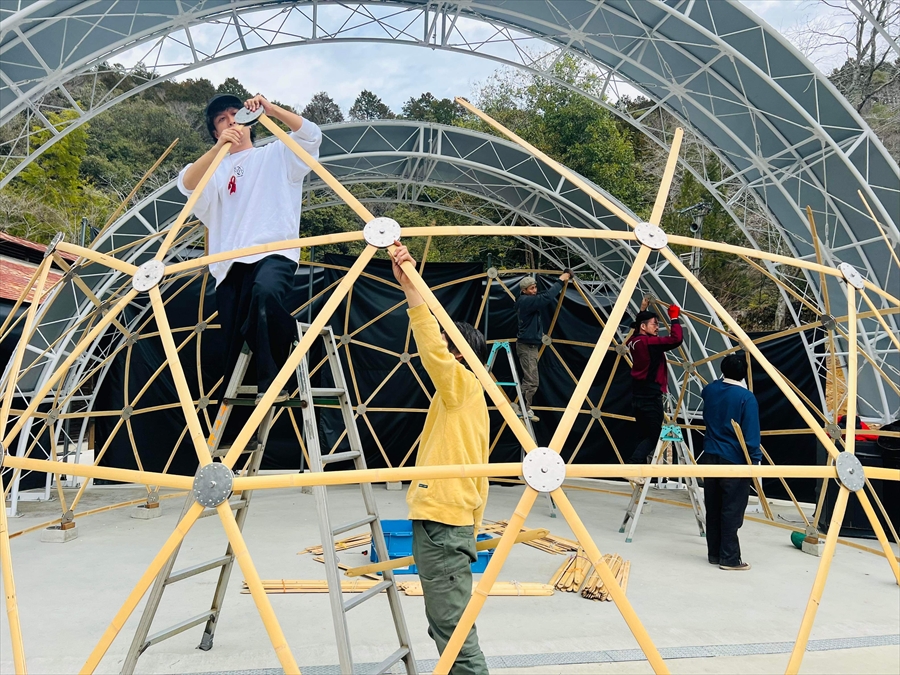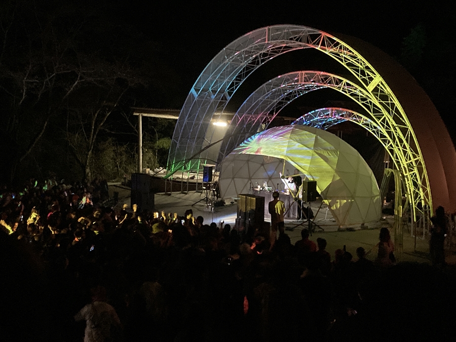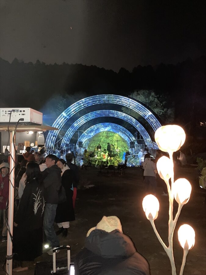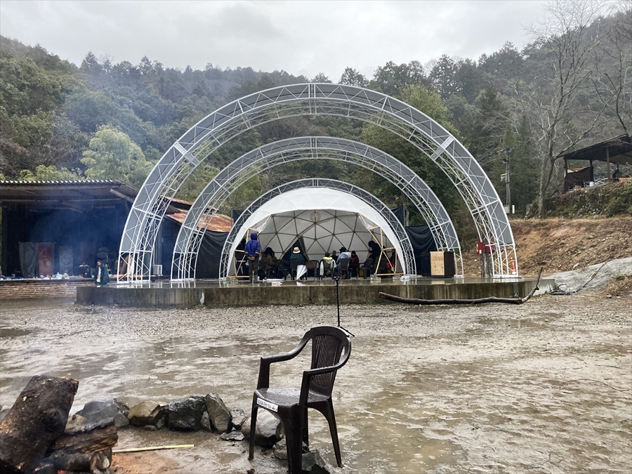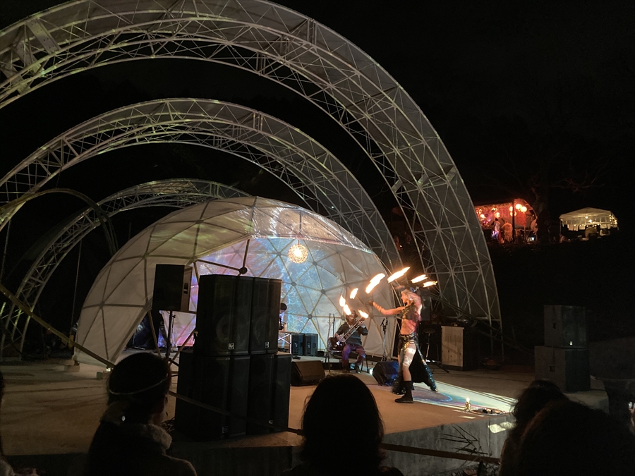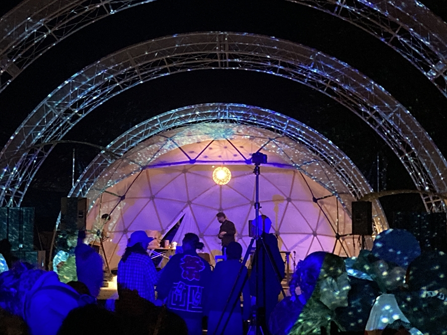 三角エコビレッジ サイハテの創設を手掛けた工藤シンク氏とは旧知の仲という事もあり、自ら志願してO祭への協力を打診する所から交渉がスタートし、開催ギリギリになって7.2mと4.8mのドームをステージとして使っていただく事になりました。