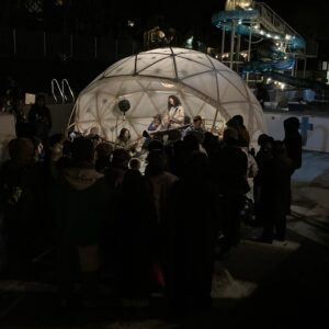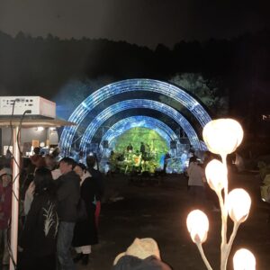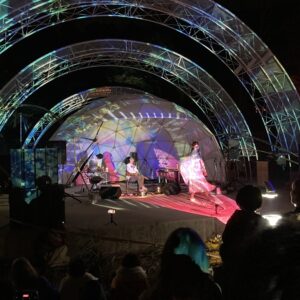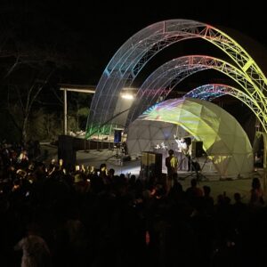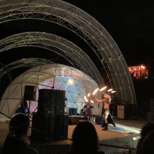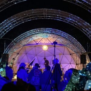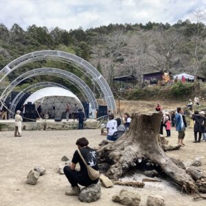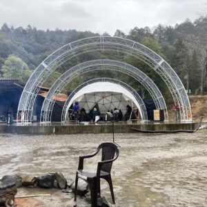 三角エコビレッジ サイハテの創設を手掛けた工藤シンク氏とは旧知の仲という事もあり、自ら志願してO祭への協力を打診する所から交渉がスタートし、開催ギリギリになって7.2mと4.8mのドームをステージとして使っていただく事になりました。