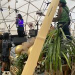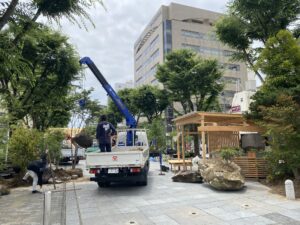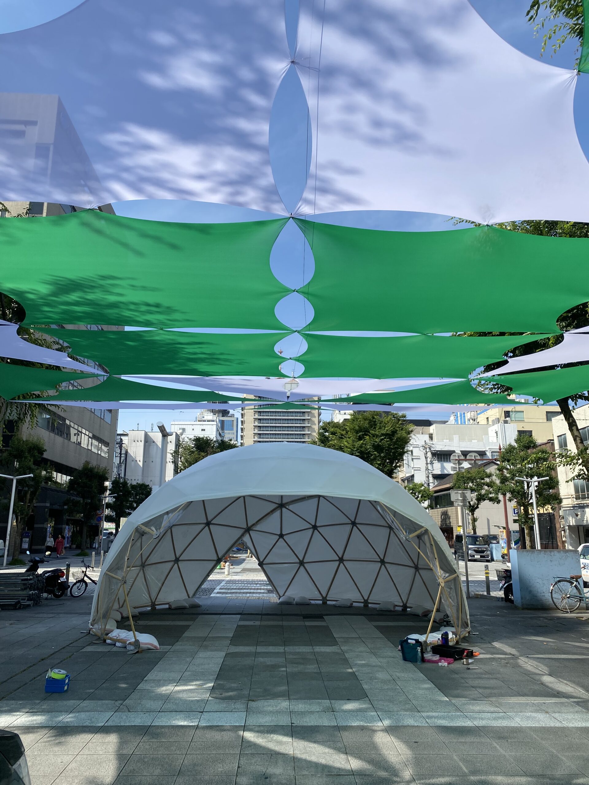 街中でやるんじゃ流石にこれまでのようなスケールではできないだろうと思いつつも、依頼された7.2mドームの設営で会場に向かうと、街の中心部の割に植栽が豊かな公園が眼前に現れ、サラリーマンも寛げる中心部のオアシス的な公園でいい場所だなぁと思いつつ、ドームのあるエリアの担当者と挨拶し、会場を案内してくれる事になりまました。
